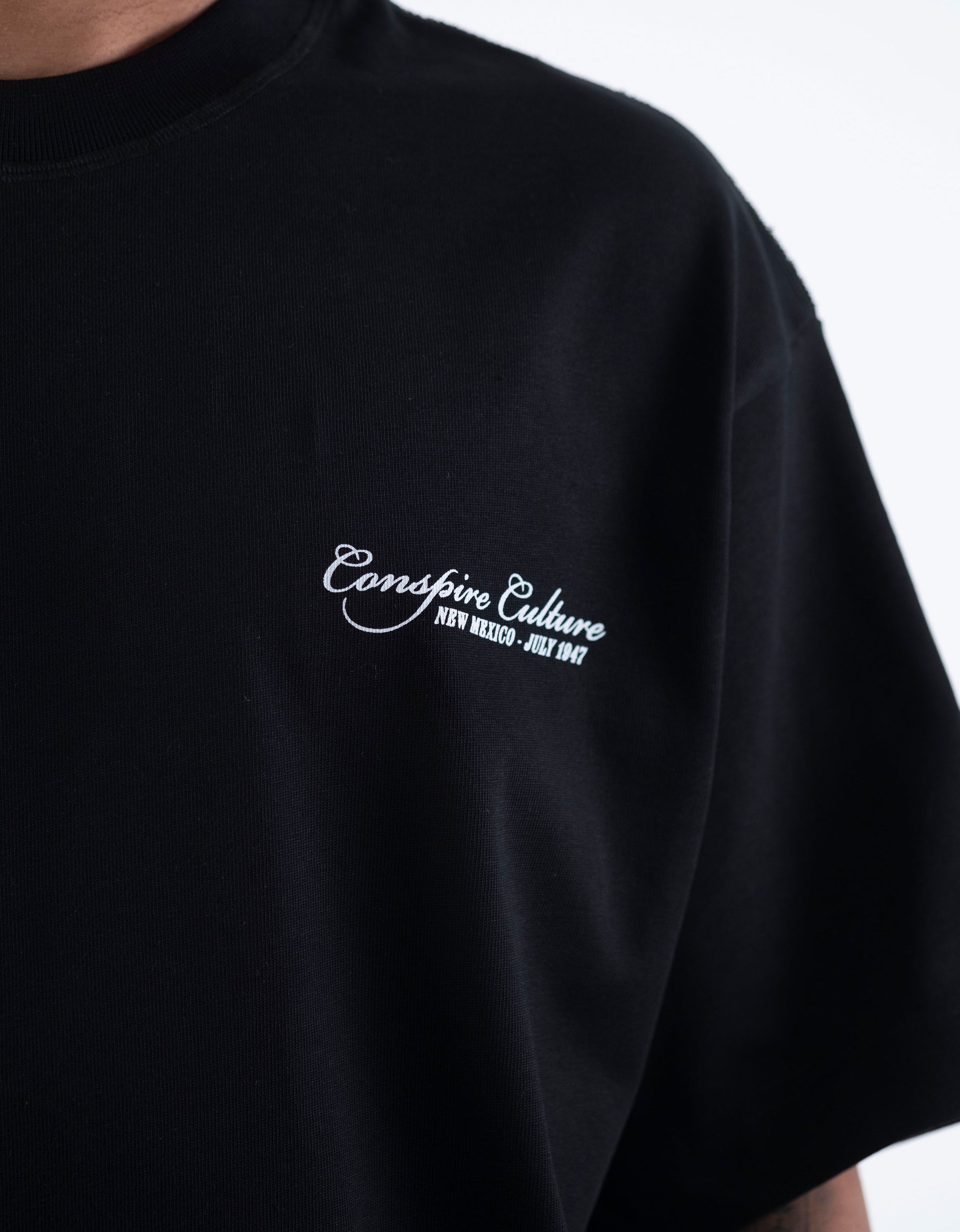 This heavyweight, relaxed-fit tee is made from 290gsm organically grown cotton, offering comfort and durability in a classic black. It's a wearable piece of history, commemorating the enigmatic Roswell incident.