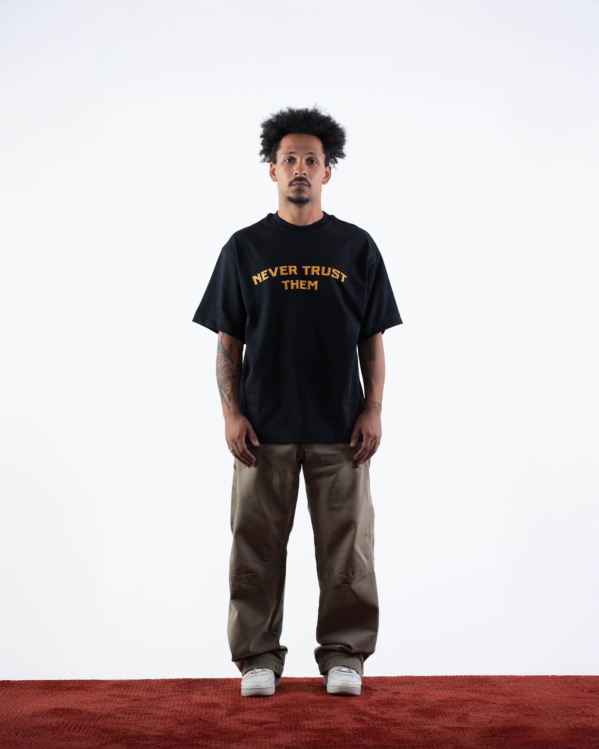 Immerse yourself in the tactile luxury of the Conspire Culture "NEVER TRUST THEM" Tee.